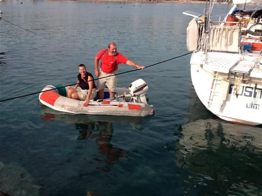 Wir haben ihm dann eine Solarpanele geliehen und gleich angeschlossen. So hatte er wenigstens ein bißchen Strom. Abends waren wir dann alle im Ort zum essen. Am nächsten Morgen fuhren Dierk und Co. weiter Richtung Koroni. Wir folgten später aber nur bis Finikunda, wo wir gegen Mittag vor dem Strand ankerten. Ich konnte mit Theo einkaufen gehen und zur Tankstelle um Sprit fürs Dinghy zu holen. Die weiteren Tage vergingen mit Arbeiten an unserer Solaranlage, Wäsche waschen, schwimmen und schlafen. Ich hatte noch den kleinen Hafen von Finikunda mit dem Dinghy erkundet, ob man dort Wasser bunkern kann. Wir entschlossen uns daraufhin in den Hafen, bzw. an dessen Außenmole zu verlegen.